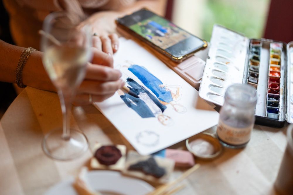 Sous leurs yeux, prennent vie des portraits minimalistes à l’aquarelle, des esquisses raffinées ou des toiles réalisées sur le moment : des créations sur mesure, empreintes d’émotion et d’élégance.