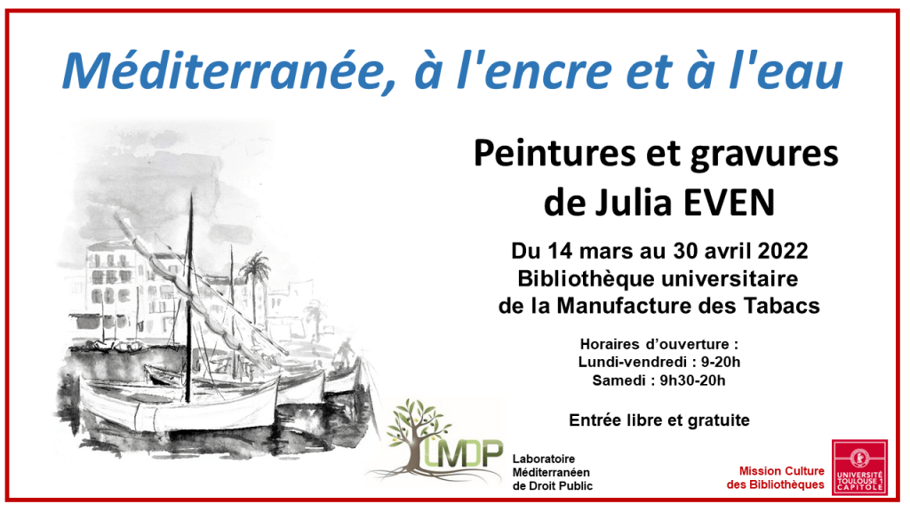 Cette exposition se compose d’une série de peintures à l’encre de chine réalisées à dessein pour la 11ème Revue Méditerranéenne de Droit Public issue de ces multiples rencontres artistico-poético-juridiques, nommée : « Itinérances juridico-poétiques en Méditerranée(s) ». Ces peintures sont voulues en noir et blanc pour correspondre à l’impression du livre.