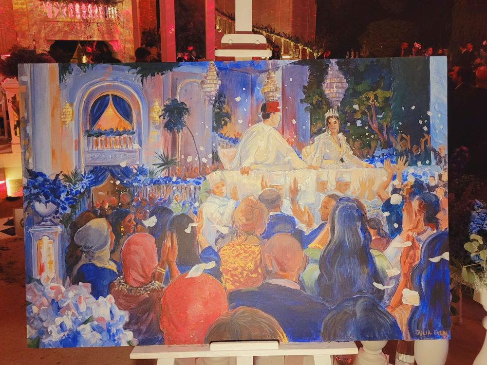 J’ai eu grand peine à prendre la photo comme la sécurité avait pour consigne de ne laisser personne photographier la cérémonie, j’ai failli me faire sortir de la salle ! Moment de panique : je n’aurai pas la photo qui m’aurait permis de finir ma toile et peindre les mariés :’). Heureusement, l’organisatrice et le chef de la sécurité sont venus à mon secours à temps, et sont restés à mes côtés le temps que je puisse faire la photo.