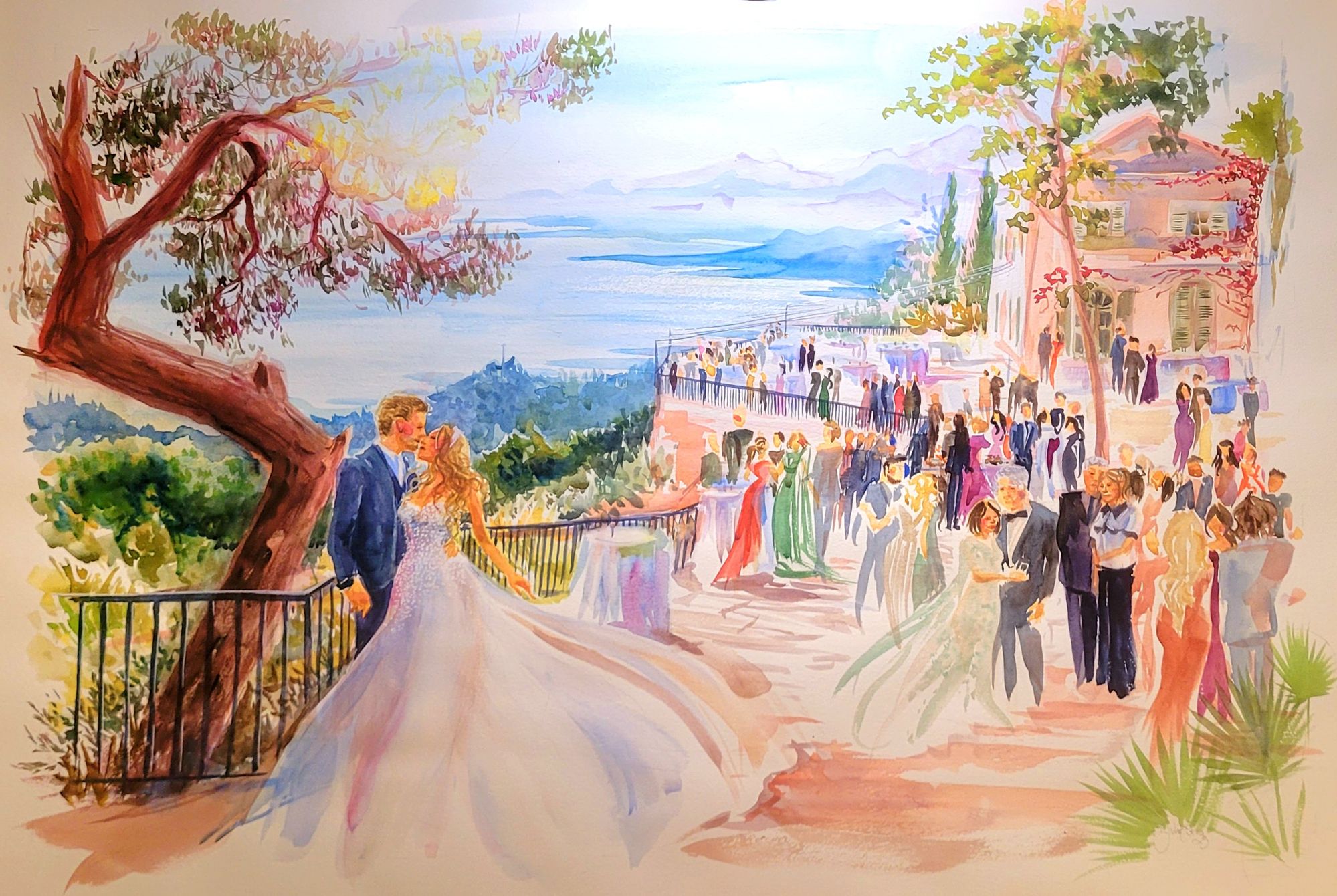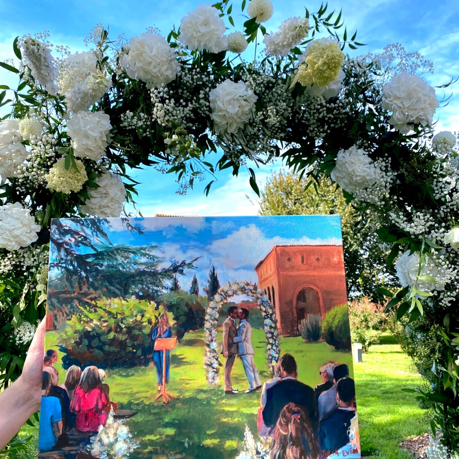 A l’occasion de votre événement, c’est vous qui choisissez le sujet qui sera peint. Pour un mariage, il peut s’agir des mariés devant le château ou le domaine qui accueille la cérémonie. Durant un séminaire d’entreprise, vous pourrez me demander de réaliser une œuvre en lien avec votre projet le plus important.