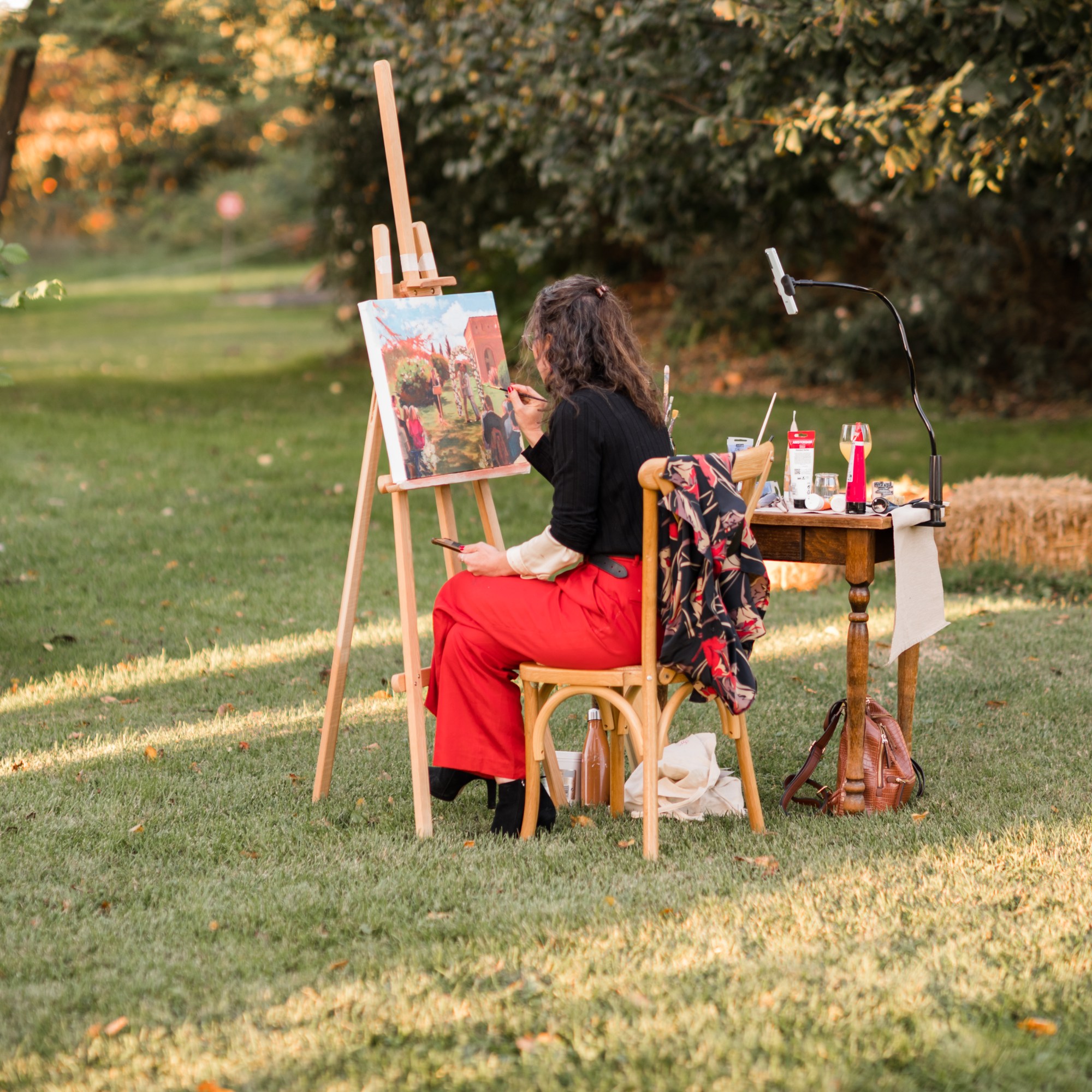 Je me rends sur le lieu de votre événement avec tout mon matériel (chevalet, toile vierge ou esquissée selon que la photo ait été envoyée en amont ou non). Je peins en direct devant vos invités, entre 4 et 7 heures.