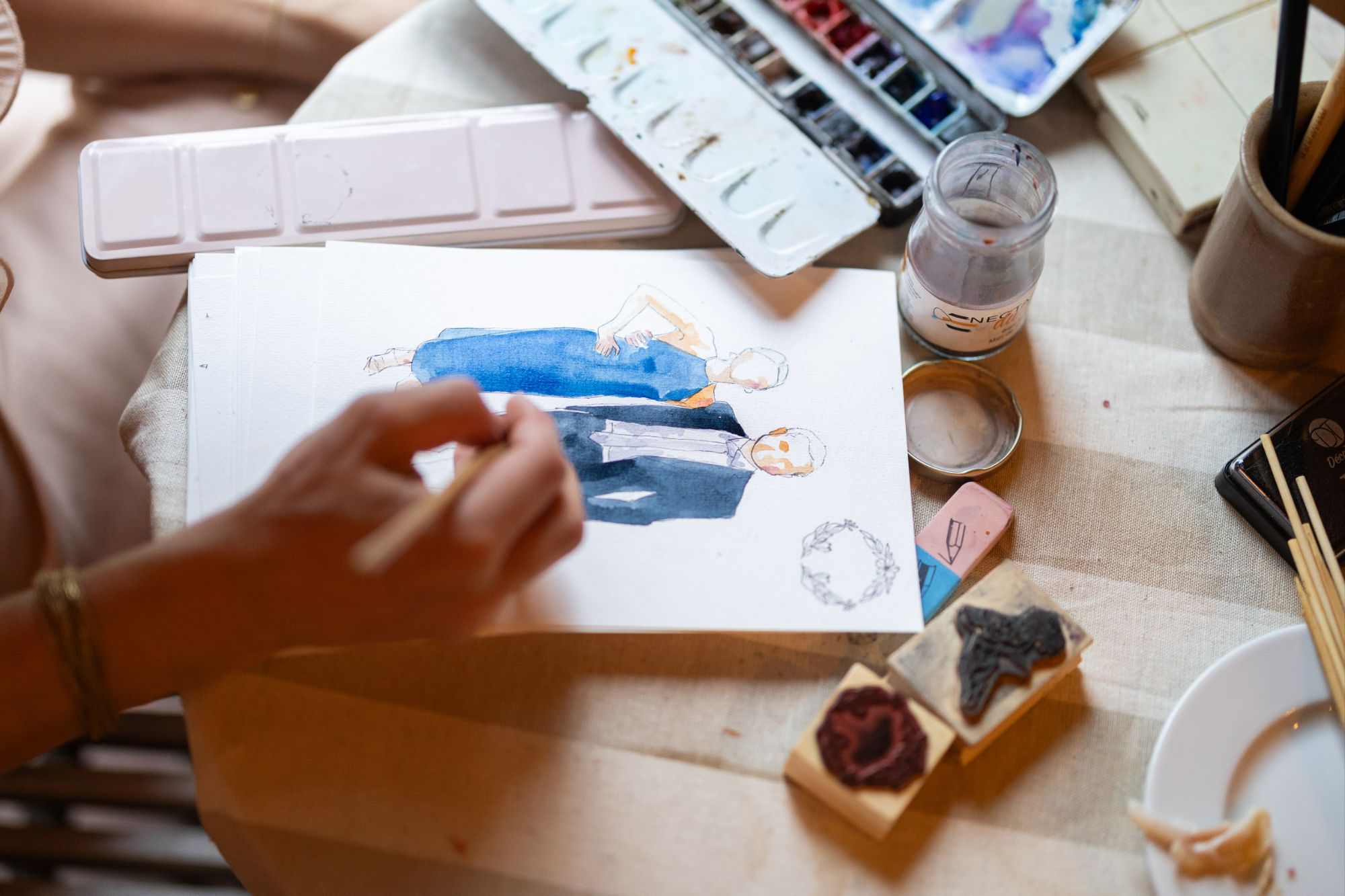 - Custom illustrations for wedding invitations (with 2 years of reproduction rights included when combined with a live painting package)