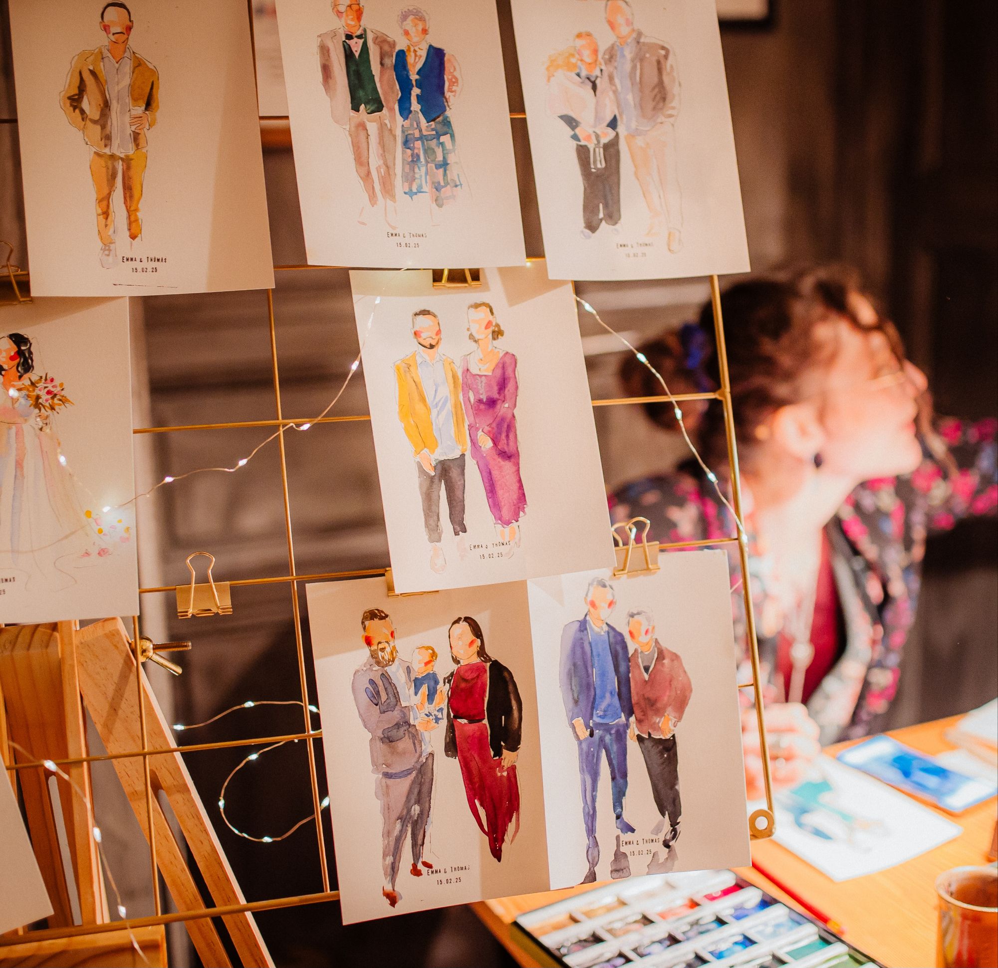 - A combined package: guest portraits + a large watercolor of the couple with the venue or first dance
