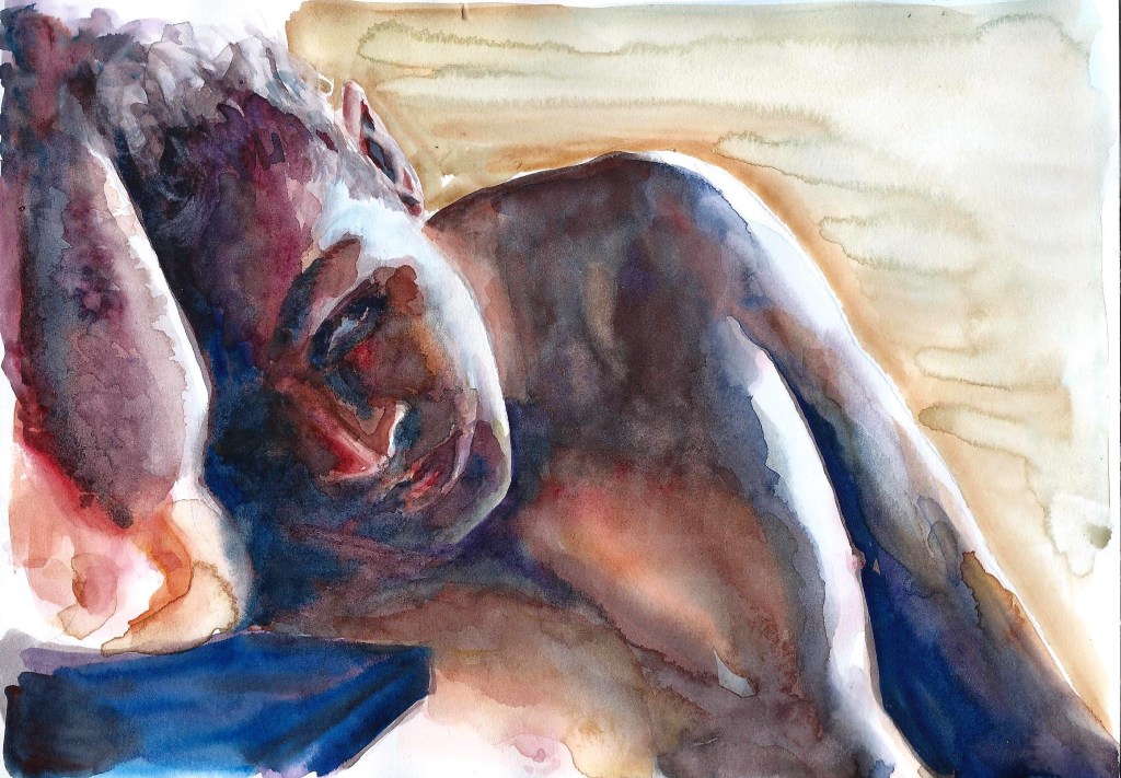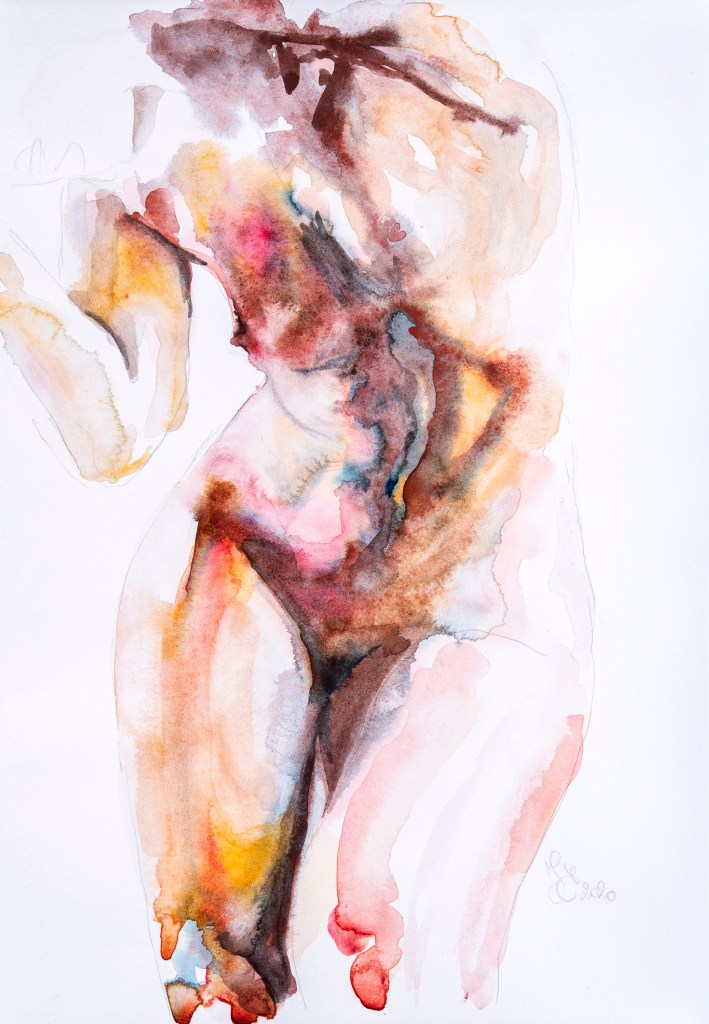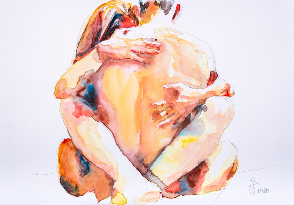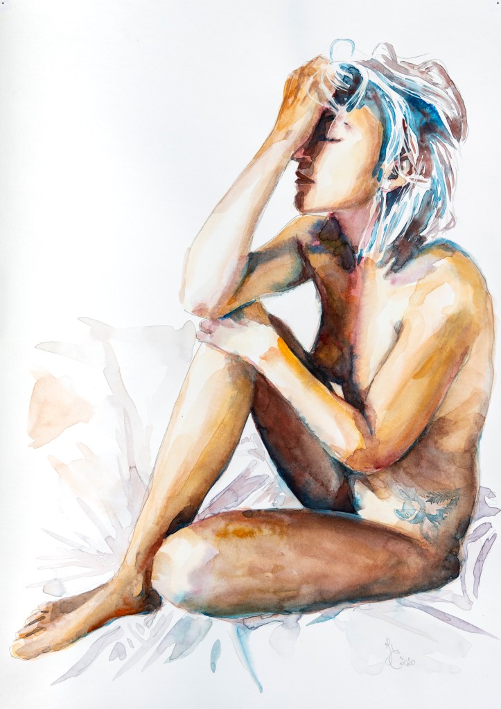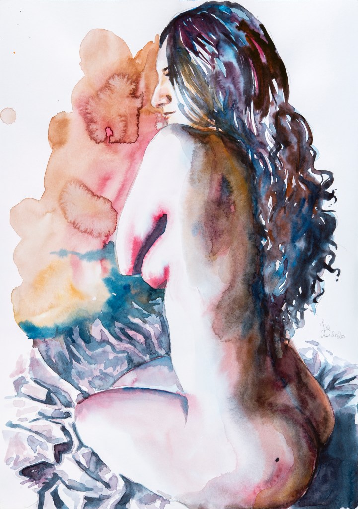 Mes peintures à l’aquarelle sont le reflet de mes émotions. Je choisis minutieusement mes modèles en fonction du lien créé, et me vide de tout autre ressenti négatif lorsque je peins.