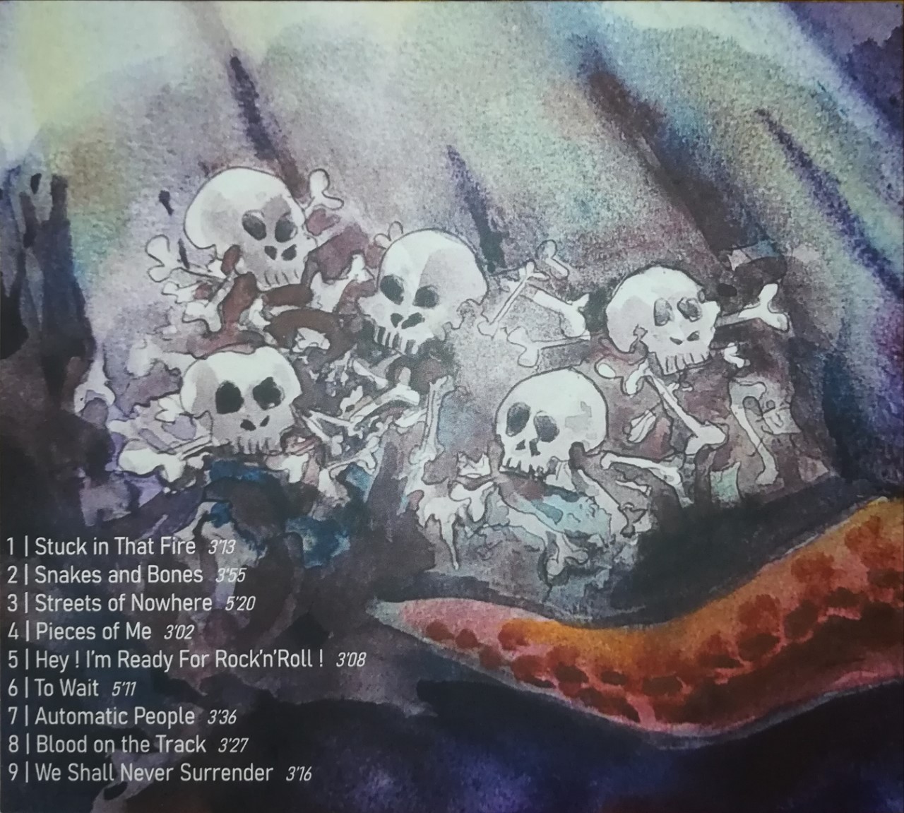 Le verso de la pochette représente les os restants des membres du groupe, ainsi que le bout de la queue du serpent qui s’en irait après avoir bien mangé…